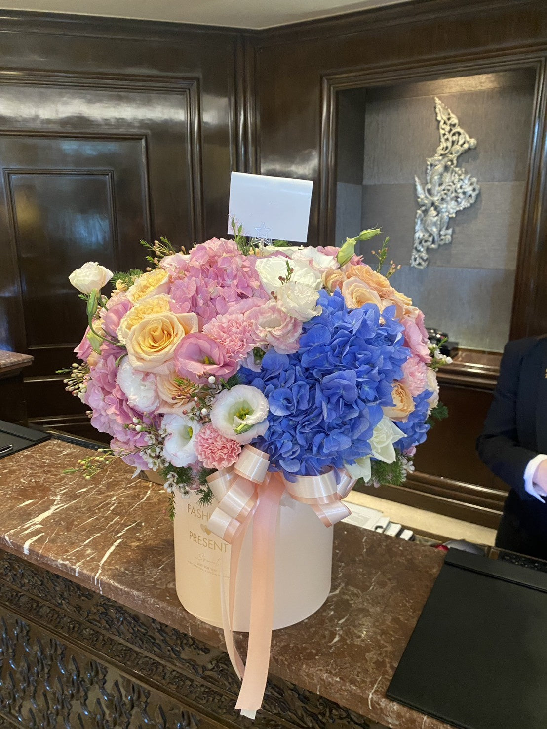 This charming box features blue and pink hydrangeas, cheerful orange roses, and delicate pink carnations — creating a heartwarming blend of colors that speaks of love, encouragement, and gentle support.